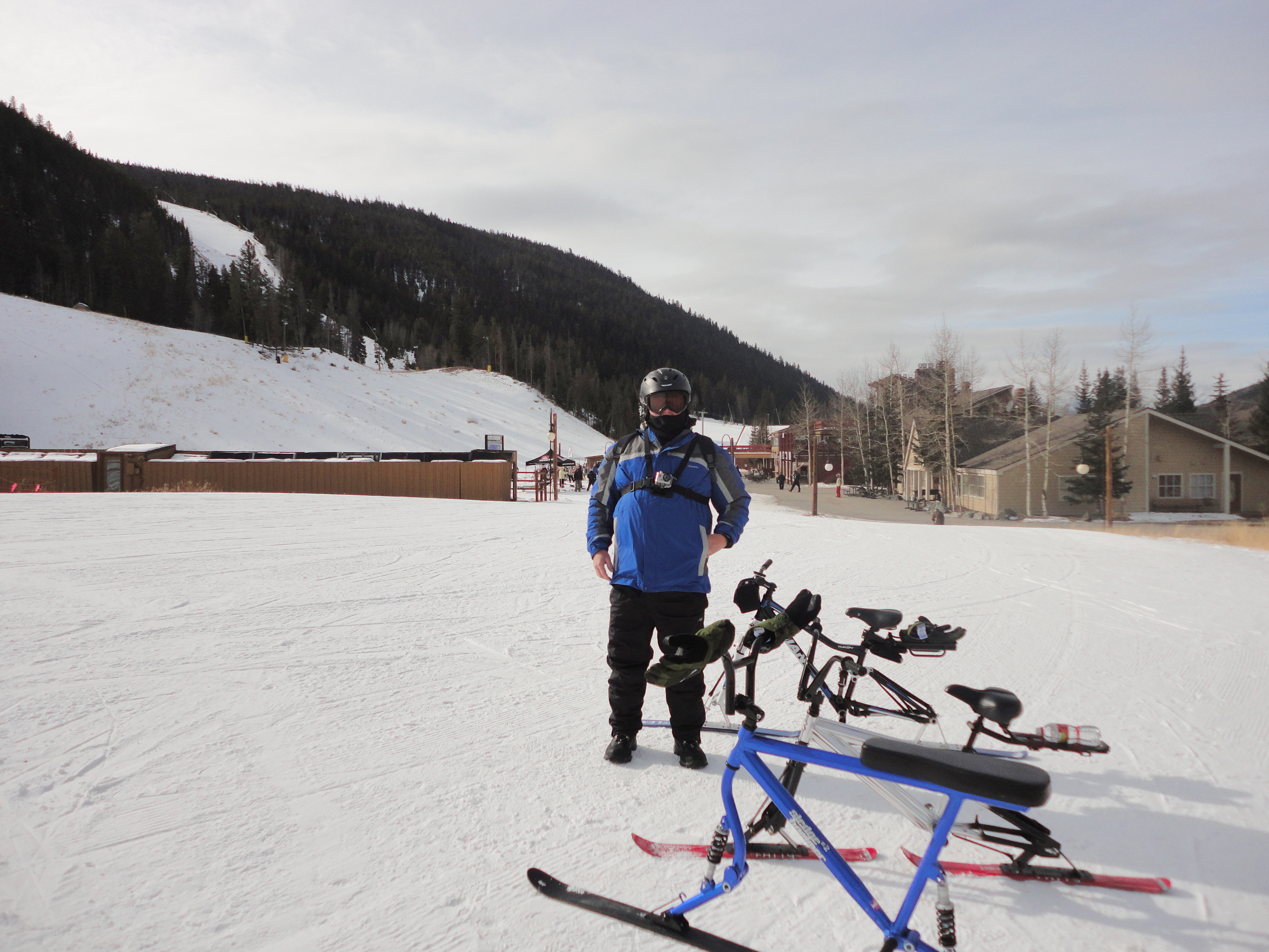 Jessie brought up a very nice camcorder that is worn around your chest so that we could film us going down the mountain runs. He also brought a GPS navigation system with speed odometer that was mounted on his ski bike handlebars. On the film footage, he got up to 32 mph but Tommy, who had a hand held GPS, had me and him hitting top speed of 45.9 mph on the ski bikes.